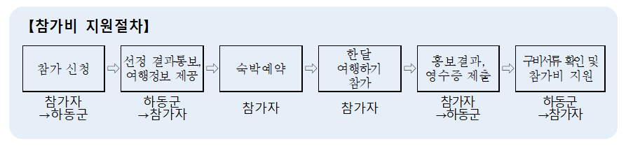 * 체험비는 전체 여행기간 내 1인당 지원 금액임, 참가자가 만 19세 미만 자녀와 동반 참가할 경우 만 19세 미만 자녀에 대해서는 숙박비, 체험비 지원 불가