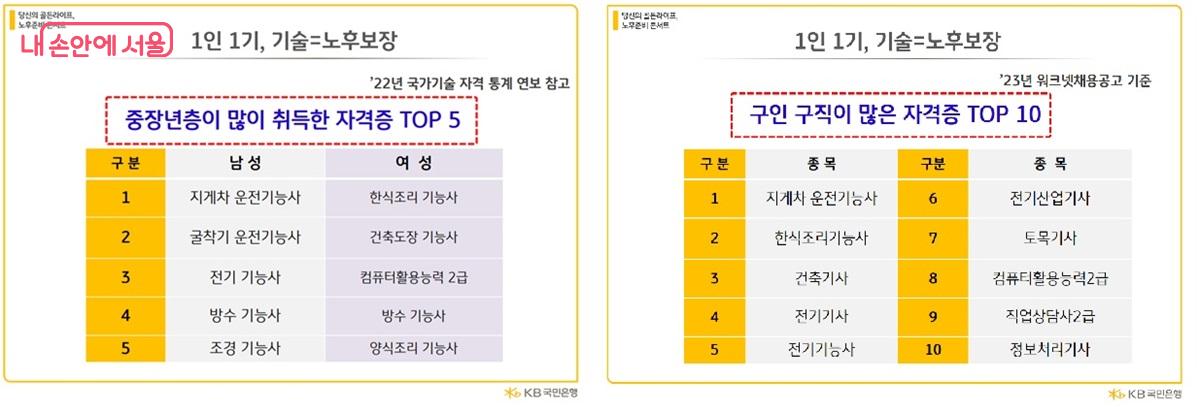 국민연금, 퇴직연금, 개인연금까지 3층 연금 체계로 노후 준비를 탄탄히 하고, 더불어 1인 1 기술을 갖춰 노후를 보장하는 것도 중요한 방법이라는 것을 배울 수 있었고. 여성과 남성으로 나누어 중장년 세대가 많이 취득한 자격증을 1위에서 5위까지 공개했는데, 더불어 구인 구직이 많은 자격증 순위도 함께 공개하며 도전 가능한 기술은 미리 갖춰 놓는 것도 노후를 대비하는 방법일 것입니다.