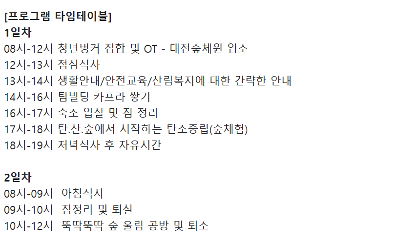 4. 국립대전 숲체원에서 진행되는 프로그램들은 극립대전 숲체원의 소관으로 청년벙커의 소관이 아닙니다.