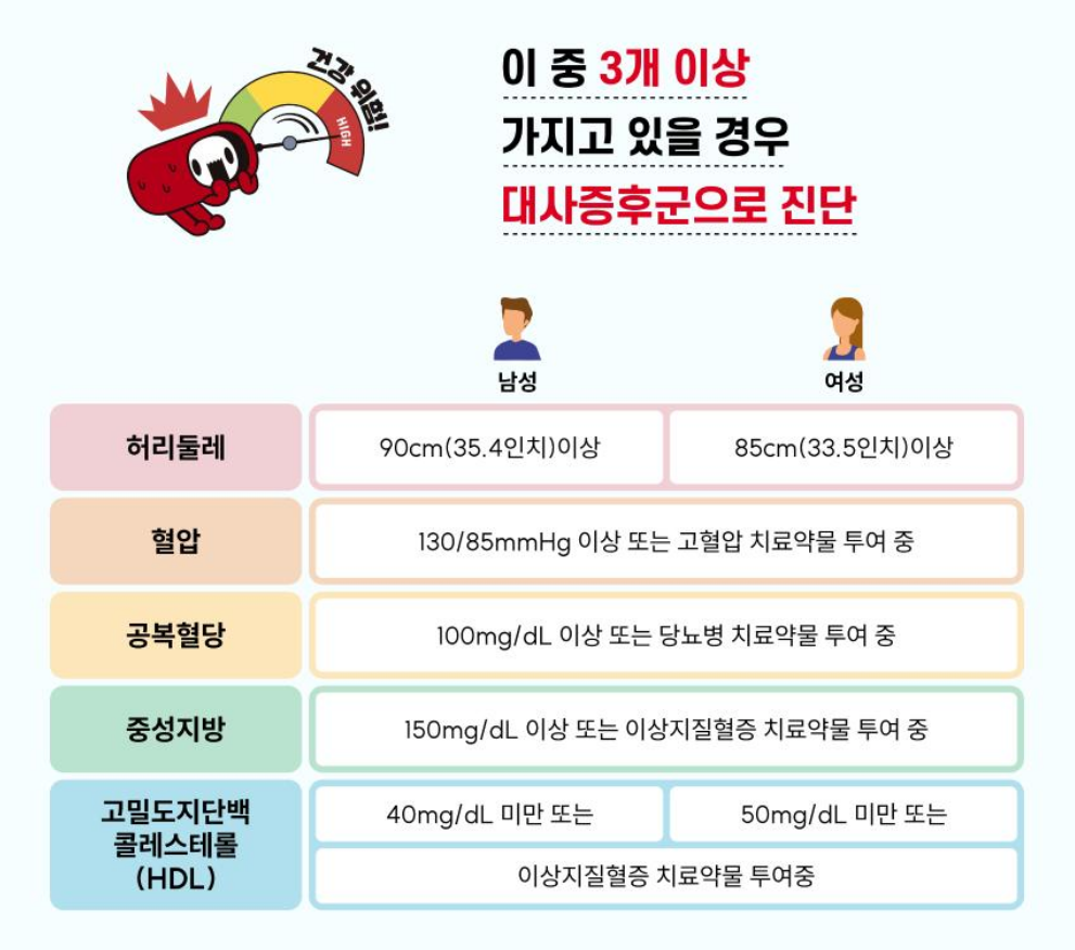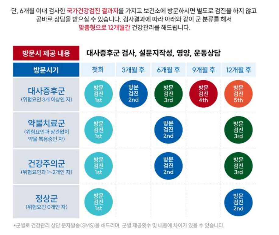 위의 내용과 같이 뇌졸증, 심근경색, 협심증, 당뇨병, 암 등을 예방하기 위해 서울시 보건소 건강관리센터 (대사증후군 전문관리센터)에서 서울시민 (만 20세 ~ 64세) 누구나 대사증후군을 검사하고 상담받을 수 있습니다.
