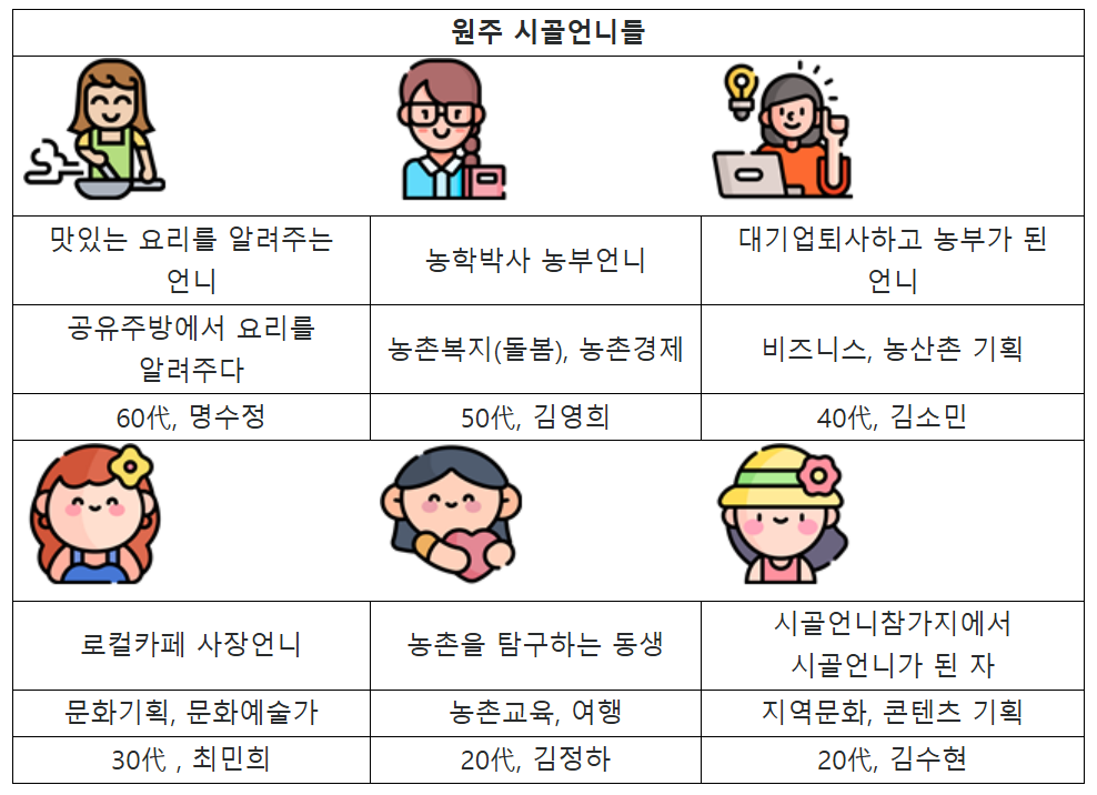 ○ 한국농산어촌네트워크에서 취업, 창업을 하고 정착한 호스트 언니들과 한국농산어촌네트워크와 협업을 통해 원주지역 내에서 활동하고 있는 이웃언니들이 참여함