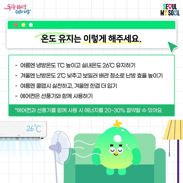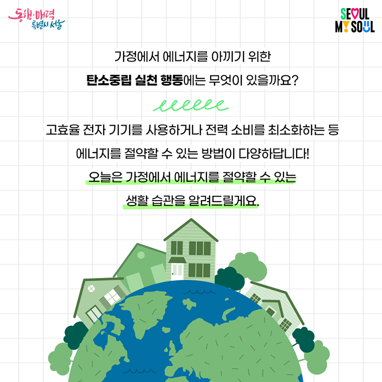 작년보다 더 심한 무더위가 계속되면서 에어컨 껐다 켰다 반복하고 계시는 분들이 많으실테고 계속되는 폭염에 냉방용품 사용이 점점 늘고 있는만큼 전기요금도 겁나는 상황인 요즘. 오늘은 가정에서 에너지를 줄일 수 있는 방법을 소개해드리고자 합니다. 우리 집 에너지 사용은 어떠한지 한 번 같이 확인해보시죠~