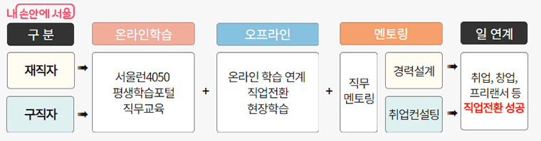 누구나 더 나은 일자리를 갖고 싶어 하고, 더 오래 일하고 싶어 합니다. 그러나 변화의 시기가 왔을 때 무엇을 어떻게 해야 할지 고민이 앞서는데요, 서울시는 전환기 중장년을 위한 교육플랫폼 ‘서울런 4050’을 운영하고 있습니다.