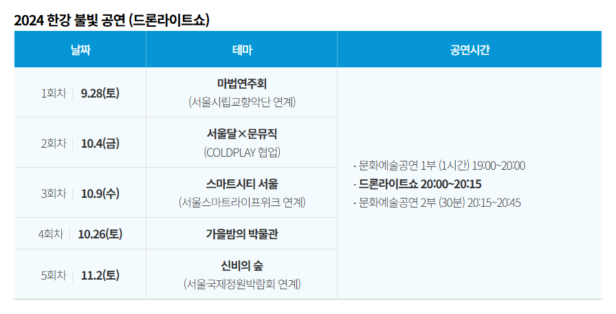 하반기 공연은 뚝섬한강공원에서 ▴9월 28일 ▴10월 4일 ▴10월 9일 ▴10월 26일 ▴11월 2일 총 5회로 진행될 예정이며, 공연시간은 ▴‘문화예술공연 1부’ 19시~20시 ▴‘드론 라이트쇼’ 20시~20시 15분 ▴‘문화예술공연 2부’ 20시 15분~20시 45분 순서로 1,000대의 드론이 한강 밤하늘을 밝히며 시민과 서울을 찾은 국내외 관광객들에게 즐거운 추억과 볼거리를 선사할 예정입니다.