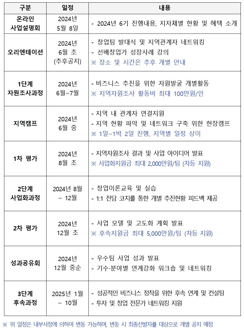 - 지원내용 : 지역연계 초기사업모델 구체화 교육 및 전문가 컨설팅 제공 등