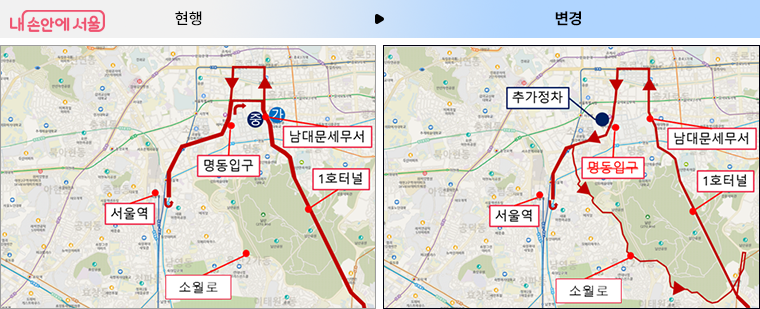 또한, 성남에서 서울 명동으로 향하는 2개 노선(9003번, 9300번)은 혼잡이 심한 명동일대와 남산 1호 터널을 우회하도록 회차경로를 기존 남산 1호 터널에서 소월로로 조정합니다. 따라서, 서울역 회차 이후 성남으로 향할 때 ‘명동입구’ 정류장을 통과하지 않고 대신 길 건너편 ‘롯데백화점’ 정류장에 정차합니다.