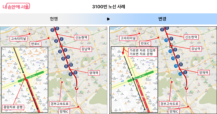 강남대로 중앙버스전용차로의 정체를 완화하기 위해 15개 노선은 일부 구간에서 가로변 차로로 조정한다.